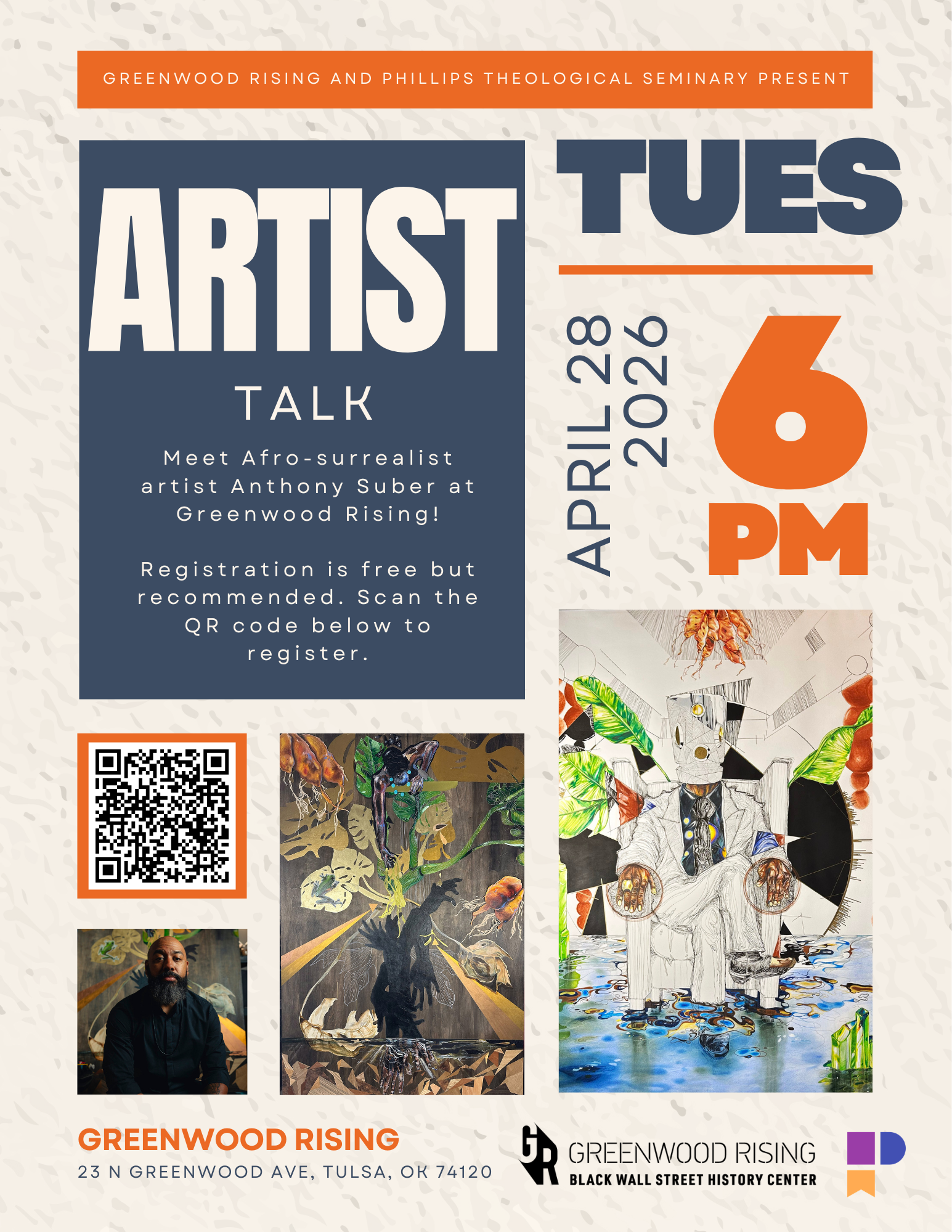 Greenwood Rising and Phillips Theological Seminary present Artist Talk, an evening conversation with acclaimed Afro-surrealist artist Anthony Suber.
